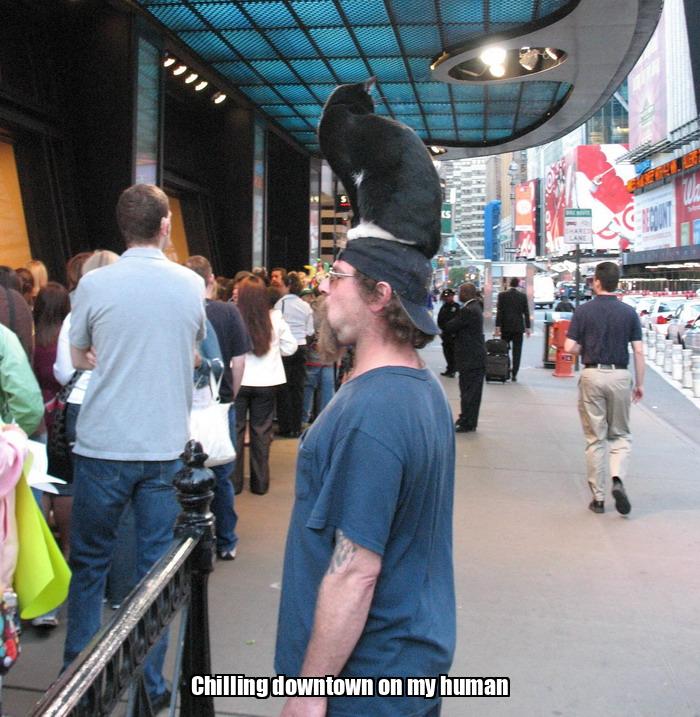 Okay, so the guy has a cat sitting on his head. The strange thing is, NOBODY NOTICES!!!