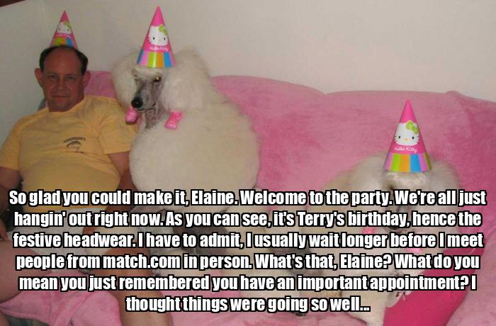 So glad you could make it, Elaine. Welcome to the party. We're all just hangin' out right now. As you can see, it's Terry's birthday, hence the festive headwear. I have to admit, I usually wait longer before I meet people from match.com in person. What's that, Elaine? What do you mean you just remembered you have an important appointment? I thought things were going so well...