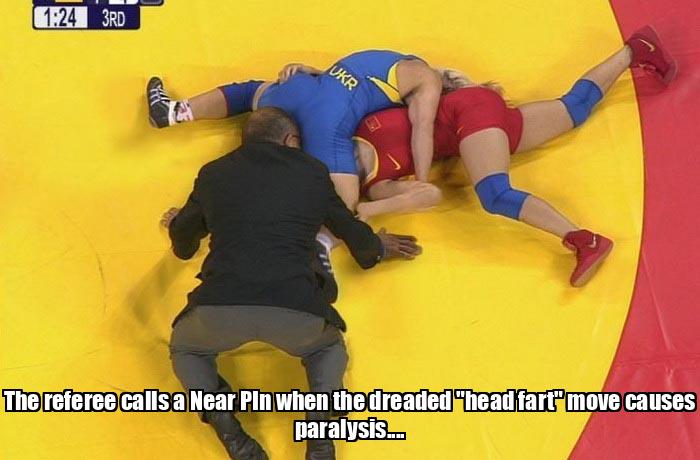 The referee calls a Near PIn when the dreaded "head fart" move causes paralysis....