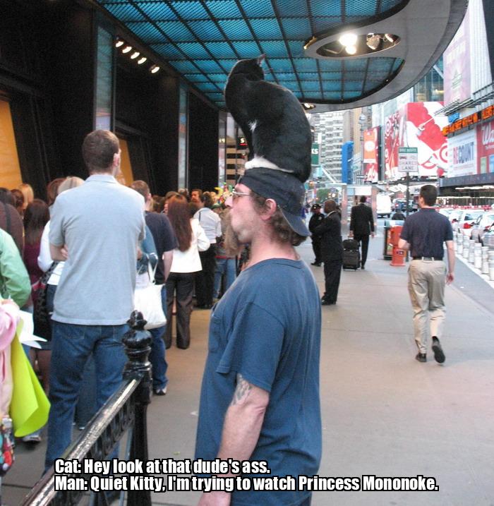 Cat: Hey look at that dude's ass. Man: Quiet Kitty, I'm trying to watch Princess Mononoke.