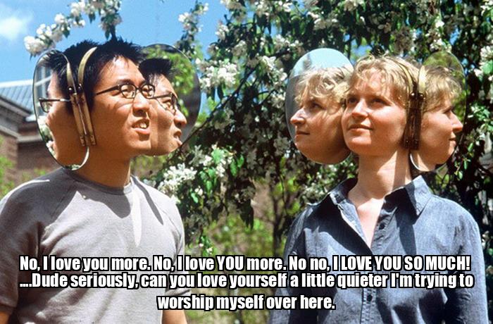 No, I love you more. No, I love YOU more. No no, I LOVE YOU SO MUCH! ....Dude seriously, can you love yourself a little quieter I'm trying to worship myself over here.