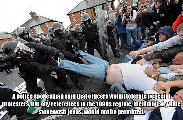 A police spokesman said that officers would tolerate peaceful protesters, but any references to the 1990s regime, including sky blue stonewash jeans, would not be permitted.