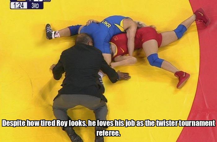 Despite how tired Roy looks, he loves his job as the twister tournament referee.